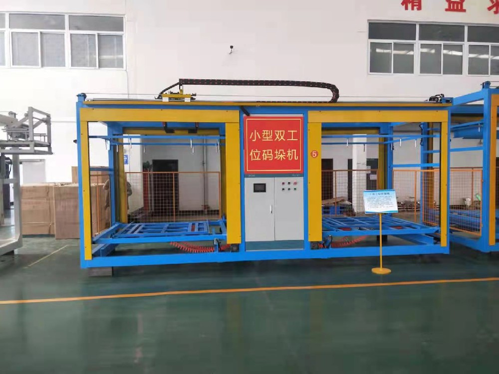 平板上工件符合棧板要求的一層工件,平板及工件向前移動直至棧板垂直面。上方擋料桿下降,另三方定位擋桿起動夾緊,此時平板復位。各工件下降到棧板平面,棧板平面與平板底面相距10mm,棧板下降一個工件高度。往復上述直到棧板堆碼達到設定要求。